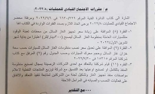 بالوثيقة .. وزارة النفط تزيد من سعر الغاز المجهز للسيارات
