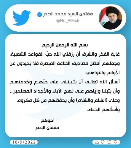 الصدر يثني على قواعده الشعبية: حبهم فخر وشرف