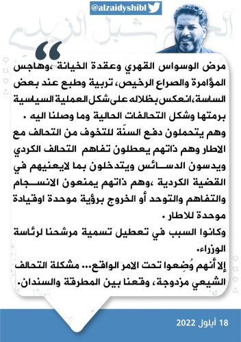 بتغريدة .. الزيدي: عقدة الخيانة وهاجس المؤامرة سبب الأزمة السياسية الحالية بالعراق