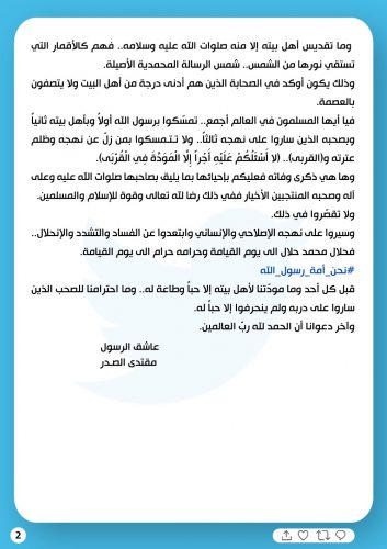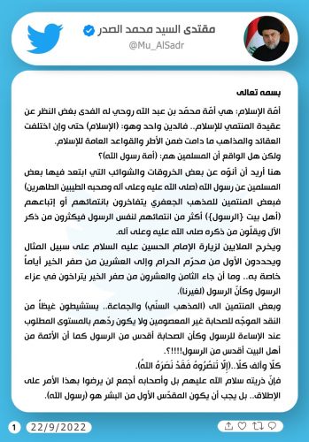السيد الصدر يوجه رسالة بذكرى وفاة الرسول (ص) ويتحدث عن آل البيت والصحابة