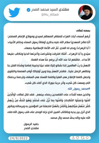 السيد الصدر معزيا بذكرى وفاة الرسول: الأمة افترقت وتكالب عليها الاعداء