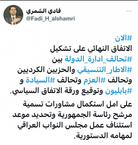 الشمري : الإعلان عن تشكيل تحالف إدارة الدولة