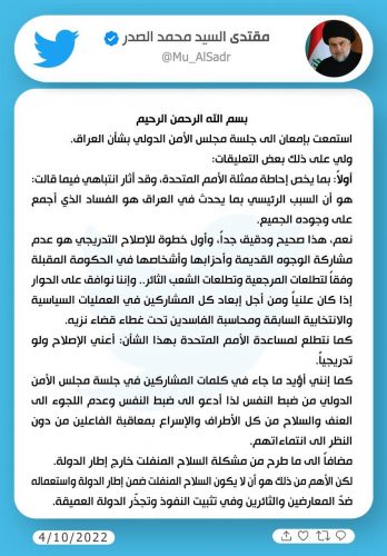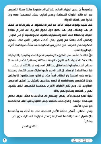 الصدر يشكر بلاسخارت على احاطتها بمجلس الامن