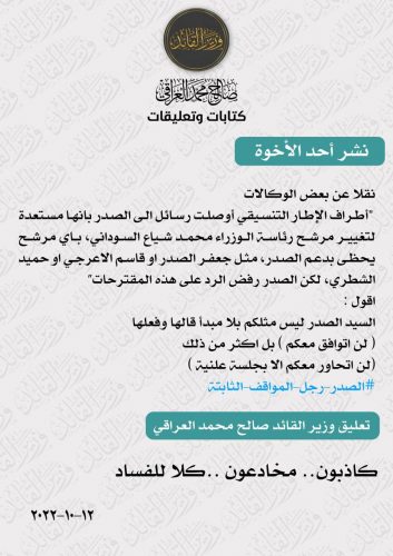 وزير الصدر بشأن تغيير مرشح الاطار لرئاسة الوزراء: كاذبون .. مخادعون.. كلا للفساد