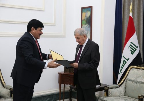 وأضاف البيان، أن “السفير السوري سلم رئيس الجمهورية رسالة خطّية من الرئيس السوري بشار الأسد حملت تهانيه بمناسبة انتخابه رئيسا للجمهورية، وتمنى له الموفقية والنجاح في مهام عمله لتحقيق كل ما يتطلع إليه الشعب العراقي من نمو وتطور”.