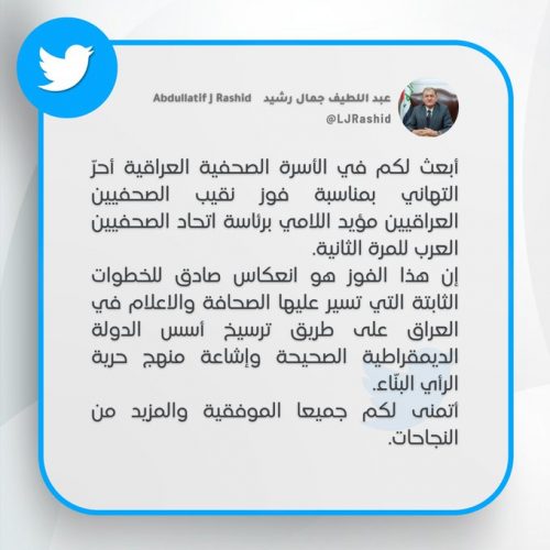 بتغريدة .. رئيس الجمهورية مهنئا نقيب الصحفيين العراقيين: فوزك انعكاس صادق للخطوات الثابتة