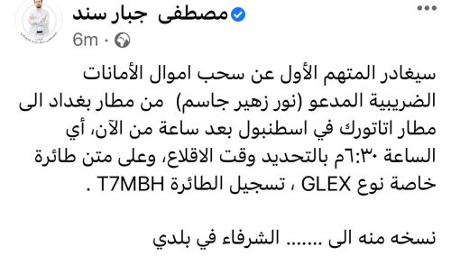 بتغريدة .. سند: المتهم الأول بسرقة أمانات الضرائب سيغادر إلى خارج العراق بطائرة خاصة
