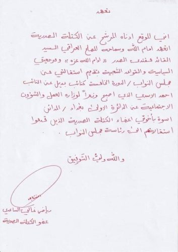 النائب البديل عن وزير العمل يقدم استقالته أسوة بباقي أعضاء الكتلة الصدرية