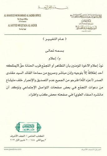 مكتب الصدر : التظاهر أو التجمّع قرب الحنانة حقّ لا يمتلكه أحد إطلاقاً إلاّ بتوجيه وإذن مباشر