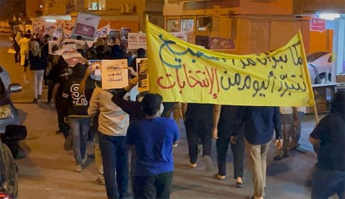 وطالب المتظاهرون في وقفة احتجاجية بالدراز مساء الثلاثاء، بمقاطعة الانتخابات الصورية، وعدم المشاركة بها، كونها تخدم المسار السياسي للطبقة الحاكمة وهو التطبيع مع كيان الاحتلال “الاسرائيلي”.