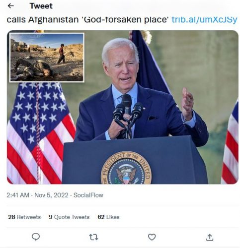 وخلال كلمة ألقاها في مدينة سان دييغو الخميس، قال بايدن: “لقد ذهب كثيرون منكم إلى أفغانستان. لقد كنت في كل جزء منه. إنه مكان نسيه الله (God-forsaken place).. مكان نسيه الله”، وهي المرة الثانية التي يستخدم فيها هذه العبارة بعد أن روى قصة رحلة إلى أفغانستان ضمن وفد من الكونغرس عام 2008، عندما تقطعت بهم السبل في الثلج.