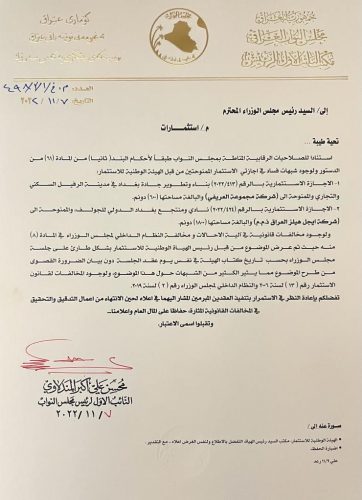 بالوثيقة : المندلاوي يدعو لإعادة النظر في اجازتي استثمار مدينة الرفيل ومنتجع بغداد للجولف
