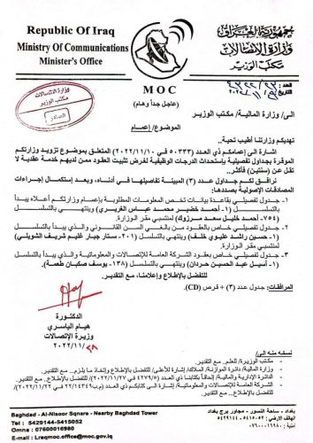 بالوثيقة.. وزير الاتصالات تصادق على قوائم تثبيت العقود