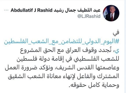 رئيس الجمهورية يجدد موقف العراق الداعم لإقامة دولة فلسطين وعاصمتها القدس الشريف