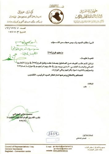 بالوثيقة.. الحلبوسي يحيل طلبا يتعلق بتثبيت العقود إلى المالية النيابية