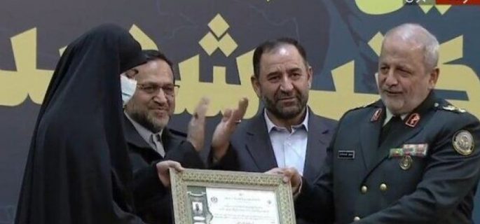 وفي هذا اللقاء قدم اللواء أحمدي مقدم رئيس جامعة الدفاع الوطني العليا شهادة الدكتوراه الفخرية لأسرتي الشهيد سليماني وأبو مهدي المهندس.