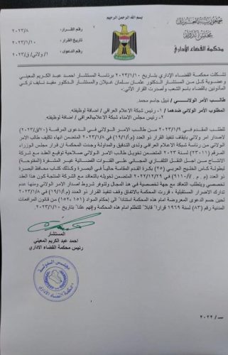 بالوثيقة .. القضاء الإداري يوقف قرار إنهاء تكليف رئيس شبكة الإعلام العراقي