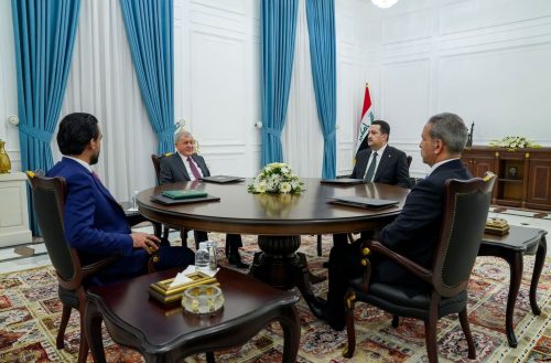 وقال المكتب الإعلامي للسوداني في بيان، تلقت *الرأي* الدولية نسخة منه، إن “رئيس مجلس الوزراء محمد شياع السوداني استضاف في القصر الحكومي، اجتماعاً ضم رئيس الجمهورية عبد اللطيف جمال رشيد, ورئيس مجلس النواب محمد ريكان الحلبوسي, ورئيس مجلس القضاء الأعلى القاضي فائق زيدان”.
