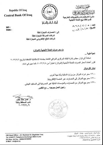 بالوثيقة.. تعميم من البنك المركزي باعتماد السعر الجديد لصرف الدولار