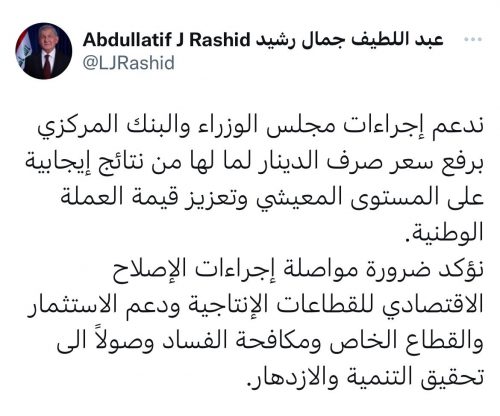 رشيد : ندعم إجراءات مجلس الوزراء والبنك المركزي برفع سعر صرف الدينار