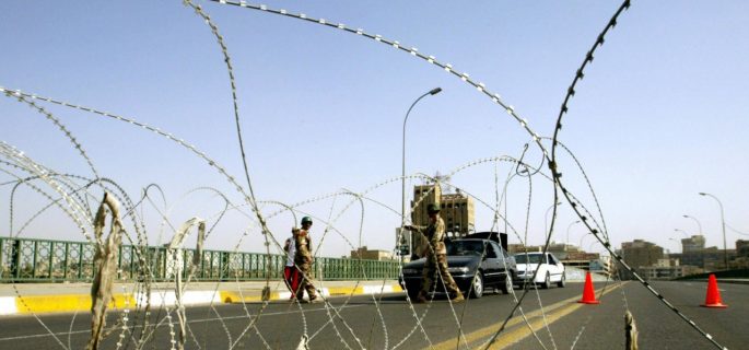 Baghdad, IRAQ: Iraqi soldiers stop cars that broke a curfew on vehicles imposed in Baghdad 16 March 2006. The Iraqi parliament convened for the first time amid worsening communal violence and with no sign of a deal on a government of national unity. The streets of the capital were eerily quiet with vehicle traffic barred to keep car bombers at bay, while police and army units multiplied their checkpoints across the city. The government told civil servants to take a holiday and many other residents bunkered down at home, fearing attacks by insurgents bent on proving the caretaker government cannot guarantee security. Most shops remained closed. The 275 members of parliament, elected on December 15, were to be sworn in. AFP PHOTO/SABAH ARAR (Photo credit should read SABAH ARAR/AFP/Getty Images)