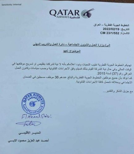 بالوثيقة : توضيح من الخطوط الجوية القطرية بشأن تسريح عددا من الموظفين العراقيين