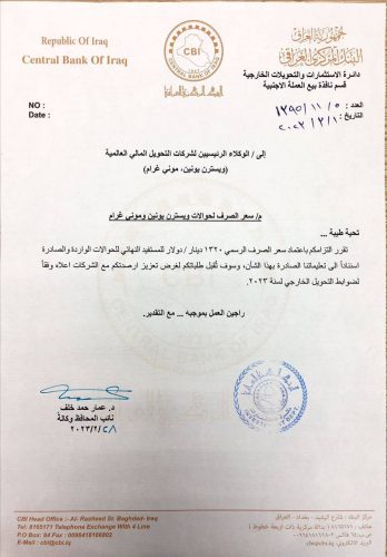 بالوثيقة : البنك المركزي يلزم شركات التحويل المالي بسعر صرف 1320 ديناراً للدولار
