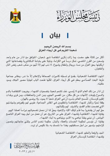 رئيس الوزراء مستذكراً انتفاضة شعبان: نؤسس لحكومة تخدم الناس وتصون كرامتهم