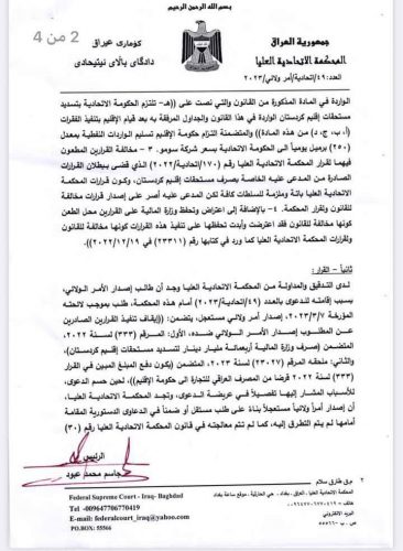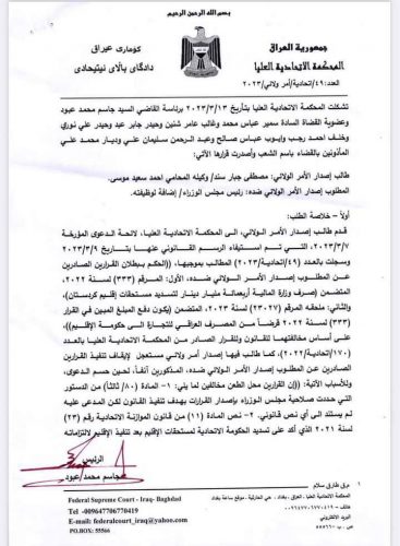 بالوثائق : الاتحادية ترد طلب الأمر الولائي بإيقاف صرف 400 مليار إلى كردستان