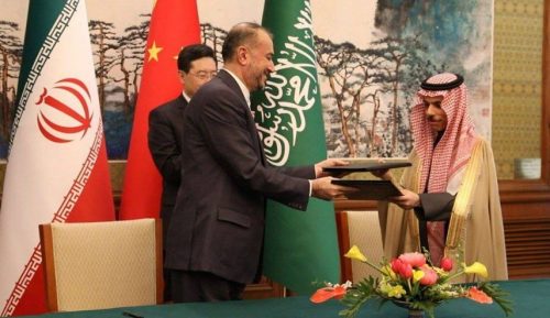 في ضوء ما تضمنه البيان الثلاثي المشترك لكل من الجمهورية الإسلامية الإيرانية، المملكة العربية السعودية و جمهورية الصين الشعبية الصادر بتاريخ 10 مارس 2023م بشأن استئناف العلاقات بين المملكة العربية السعودية والجمهورية الإسلامية الإيرانية، وفي إطار التنسيق بين البلدين حيال الخطوات اللازمة لاستئناف العمل الدبلوماسي والقنصلي بينهما جرت في العاصمة بكين بتاريخ 15 رمضان 1444هـ الموافق 6 أبريل 2023م مباحثات بين معالي السيد حسين أمير عبداللهيان، وزير خارجية الجمهورية الإسلامية الإيرانية و صاحب السمو الأمير فيصل بن فرحان آل سعود، وزير خارجية المملكة العربية السعودية،