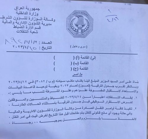 بالوثيقة : إيقاف التنقلات في وزارة الداخلية لغرض الاستقرار الوظيفي