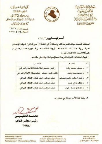 بالوثيقة.. رئيس البرلمان يوافق على استقالة رئيس وأعضاء مجلس أمناء شبكة الإعلام العراقي