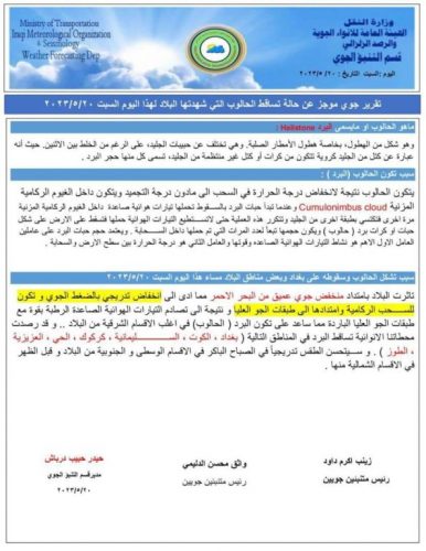 الأنواء الجوية تصدر تقريراً عن أسباب تساقط الحالوب بهذا الوقت من السنة بالعراق