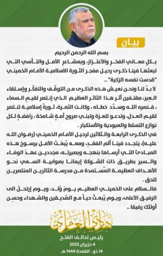 العامري بذكرى رحيل الخميني: ثائر عظيم انتصر لقيم السماء