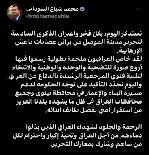 السوداني: العراقيون خاضوا ملحمة بطولية رسموا فيها أروع صورة للتضحية والوحدة والوطنية