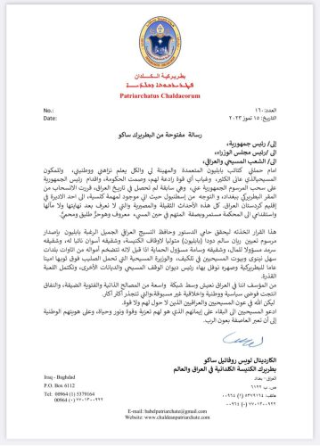 البطريرك الكاردينال ساكو يقرر نقل سلطاته من بغداد إلى أربيل ويوجه رسالة مفتوحة