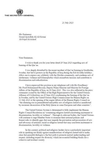 نص رسالة الأمين العام للأمم المتحدة أنطونيو غوتيريش إلى المرجع الديني الأعلى السيد السيد السيستاني بشأن حرق القرآن.