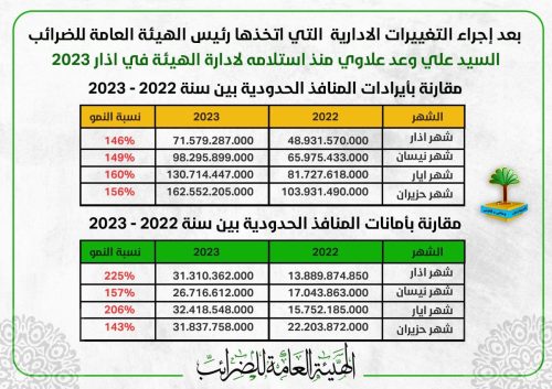 حققت الهيئة العامة للضرائب مستوى نمو في الإيرادات غير مسبوق خلال الأشهر الماضية من العام 2023 مقارنة بمستوى النمو للعام الماضي 2022 حيث بلغت إيرادات المنافذ الحدودية مستويات قياسية من النمو بحسب الأرقام والجداول المرفقة.