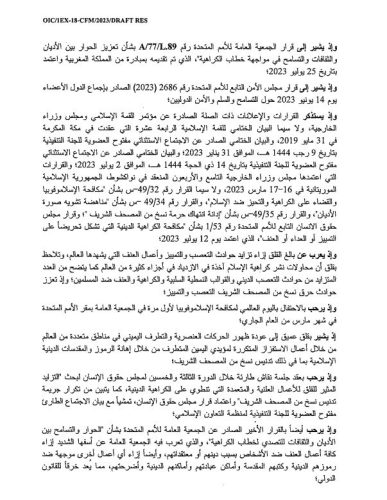 -العمـل علـى مكافحـة ظـاهرة الإسلاموفوبيا، مـن خــلال تأطير ثقـافي وخطـاب دولـي مـعـتـدل توثقـه القرارات الدوليـة والصـكوك الأمميـة ذات العلاقة.