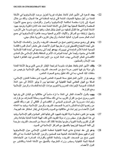 -ندعو الأمين العـام وسـفراء الدول الأعضـاء فـي منظمـة التعـاون الإسلامي في العواصـم التـي تقـع فيهـا جريمـة انتهـاك حرمـة نسـخ مـن المصـحف الشـريف والرمـوز الإسـلامية المقدسـة الأخـرى، لبذل مزيـد مـن الجهـود الجماعيـة علـى مسـتوى البرلمانـات الوطنيـة ووسـائل الإعـلام ومنظمـات المجتمـع المـدني والمؤسسـات الحكوميـة فـي تلـك الـدول للتعبيـر عـن مـوقـف أعضـاء منظمـة التعـاون الإسلامي.