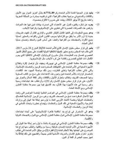 -تكثيف الجهـود والعمـل علـى إصـدار قـرارات دوليـة مستقبلا وكلمـا تطلـب الأمـر ذلك تتضـمن عدم الإساءة إلى الكتب السماوية أو ازدراء الأديان والرموز الدينية.