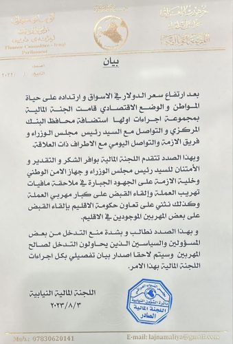 المالية النيابية تعلن قيامها بمجموعة من الاجراءات بعد ارتفاع سعر الدولار