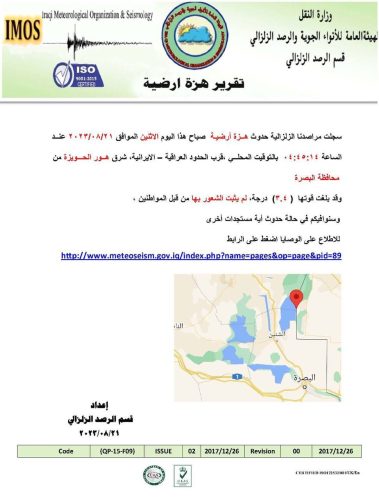 وزارة النقل تسجل حدوث هزة أرضية شرق هور الحويزة في البصرة