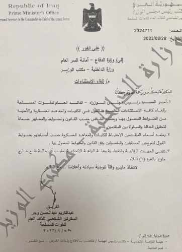 بالوثيقة : السوداني يأمر بإلغاء الاستثناءات الخاصة بالقبول في الكليات والمعاهد العسكرية والأمنية