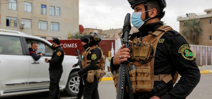 Members of the Iraqi security forces stand guard ahead of the planned visit of Pope Francis to Iraq, in Baghdad, Iraq March 4, 2021. REUTERS/Teba Sadiq