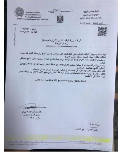 بالوثيقة : الوقف السني يوجه بإقامة صلاة الجمعة الموحدة في جانبي الكرخ والرصافة