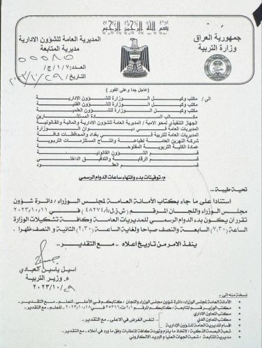 بالوثيقة: التربية تغير موعد بدء وانتهاء ساعات الدوام الرسمي في مديرياتها