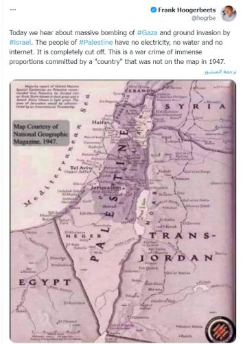 ووصف هوغربيتس، ما يقوم به الاحتلال الإسرائيلي في غزة من قصف وحشي وقطع للإنترنت والكهرباء والمياه، بأنه جرائم حرب ذات أبعاد هائلة، موجها في الوقت ذاته رسالة قوية لما يقال عنها “إسرائيل”، قائلًا: “لم تكن على الخريطة عام 1947.”