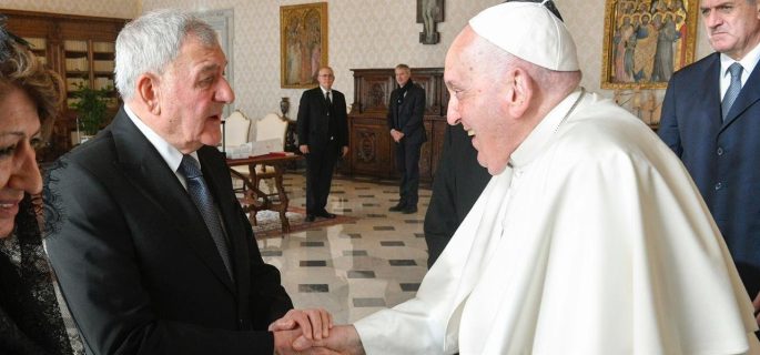 وعبّر رئيس الجمهورية في مُستهل اللقاء عن “شكره لقداسة البابا لزيارة العراق”، مؤكدا أن “العراقيين يتذكرون بمحبة واعتزاز هذه الزيارة التي جسدت مفاهيم التعايش السلمي وعمق الأواصر بين الأديان داخل العراق وخارجه”.