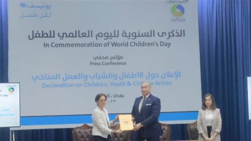 وأوضح، أن “التعاون الاستراتيجي مع اليونيسيف يصب في مصلحة الحكومة العراقية في تطوير المناخ”، مشيرا الى ان “التغيير المناخي يمثل تحديا بالنسبة لنا لتأثيراته على البيئة”.